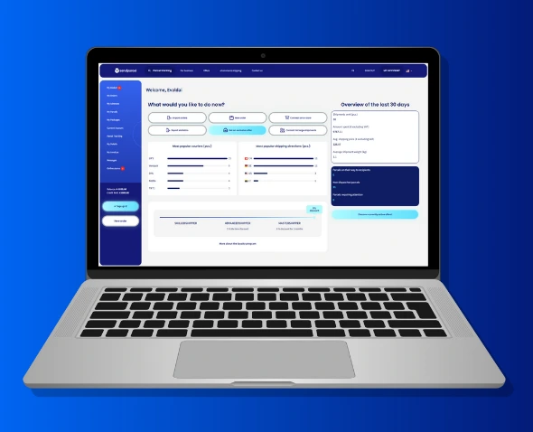 In the "My Account" section, you’ll find key stats at a glance: number of sent parcels, total costs, average price and weight, active or problematic shipments, your most-used couriers, and top shipping destinations.